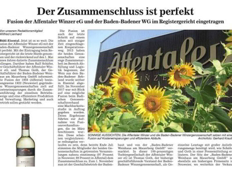 Am 22.10. 2018 ist die Verschmelzung der Affentaler Winzer eG und der Winzergenossenschaft Baden- Baden amtlich. Bereits 2014 wurde zwischen beiden Betrieben eine Kooperation in den Bereichen Flaschenabfüllung und Logistik beschlossen. In der Folge wurde eine neue Abfüllanlage am Standort Bühl von beiden Unternehmen gemeinsam angeschafft. Dort werden die Weine beider Betriebe abgefüllt. 2014/15 wurde eine neue Flaschenlagerhalle für die Baden-Badener Winzergenossenschaft am Standort in Bühl errichtet. Diese heißt nun offiziell Baden-Badener Weinhaus am Mauerberg GmbH. Die Weine der einzelnen Betriebe werden separat von unseren Kellermeistern ausgebaut, somit wollen wir die Eigenständigkeit der unterschiedlichen Lagen bewahren.