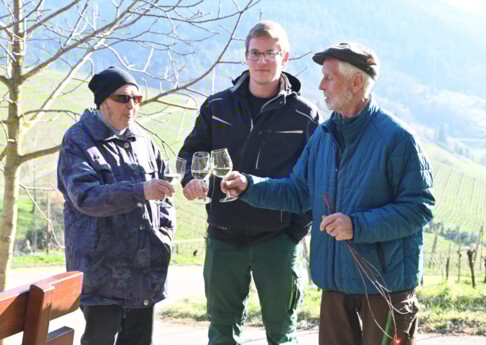 Ich treffe Jochen und Rainer Huber am Schartenberg, im Gewann „Sommerhalde“ eine nach Süd-Westen ausgerichtete Neuanlage, die die beiden im letzten Jahr mit der Sorte Spätburgunder frisch angepflanzt haben. Heute werden die Reben auf Frostschäden kontrolliert, denn in den vergangenen Tagen waren einige Grad unter null angesagt. Aber die Winzer sind zuversichtlich, der Austrieb war noch nicht genügend ausgeprägt. Noch mal Glück gehabt! Das war 2017 bei der damals angelegten Neuanlage Grauburgunder im „Betschgraben“ nicht so. Bei dem starken Frost 2017 ist die komplette Neuanlage erfroren“ erzählt Rainer Huber mit schrecken. Das Wetter ist eben nicht kalkulierbar!